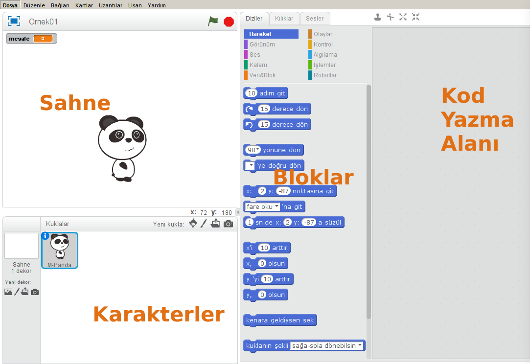Bu örneğimizde ekranda gezen bir panda kodlayacağız. Bu örneği aşama aşama kodlayarak kursiyerlere blok temelli kodlamanın mantığını aktarmaya çalışacağız.