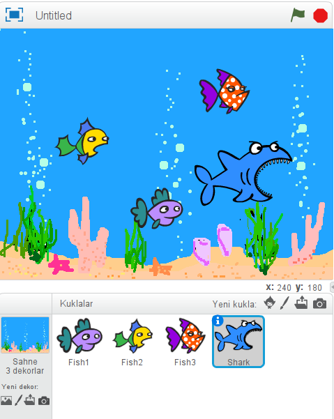 Katılımcılardan aşağıdaki gibi akvaryum kodlamaları istenir. Bu akvaryumda 3 balık ve bir köpek balığı olması gerektiği ve köpek balığının ağzını açıp kapatması istenir.