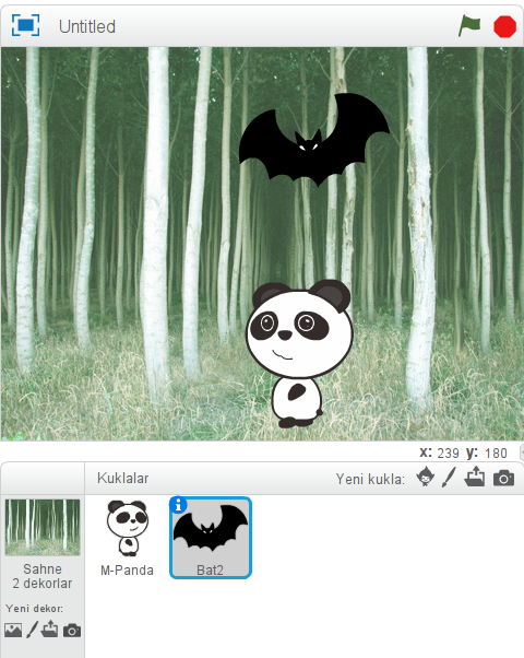 Sahne değişimi ve yeni kuklanın nasıl eklendiğini gösterdikten sonra pandamızın kodlarının yarasamıza nasıl kopyalanacağından bahsedip ek olarak yarasanın kılığını değiştirerek yarasanın kanat çırpmasını sağlarız.