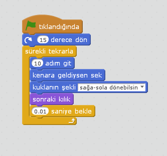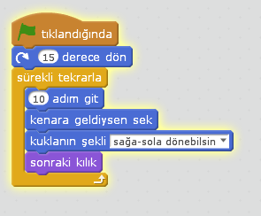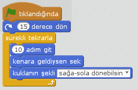 "15 derece dön" bloğu ile pandamıza ilk çalışma sırasında 15 derecelik bir açı ile çıkış yapmasını sağlayarak belirli bir hat üzerinden değil de sahnenin farklı bölgelerinde de gezinmesini sağlarız. Burada "15 derece dön" bloğunun neden sürekli tekrarla bölümünün dışında tanımlandığı katılımcılarla sorulur sürekli tekrarla blogunun içine alınarak farkın anlaşılması sağlanır.